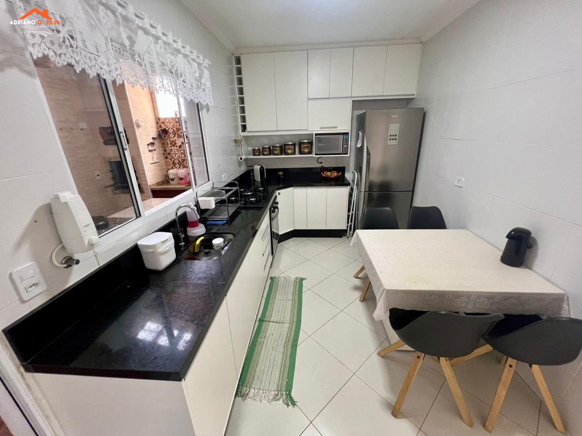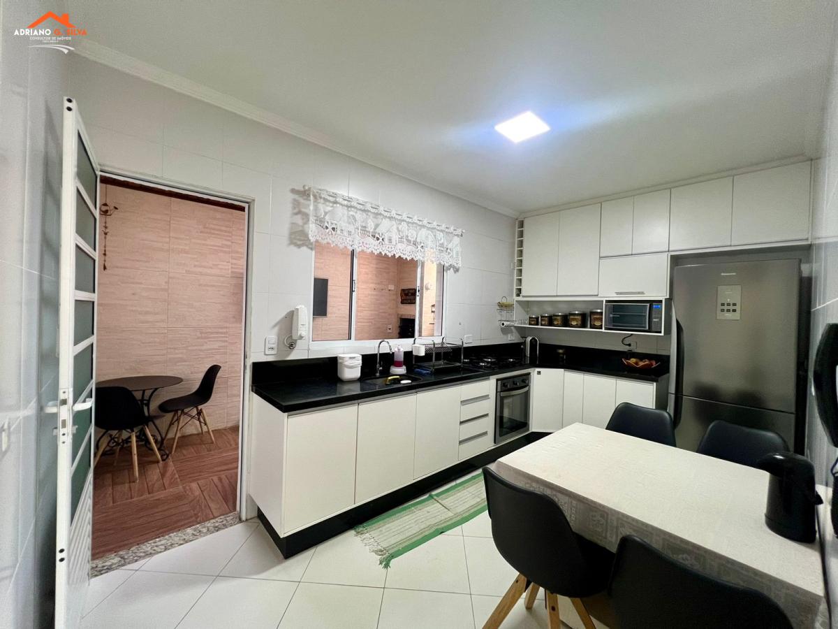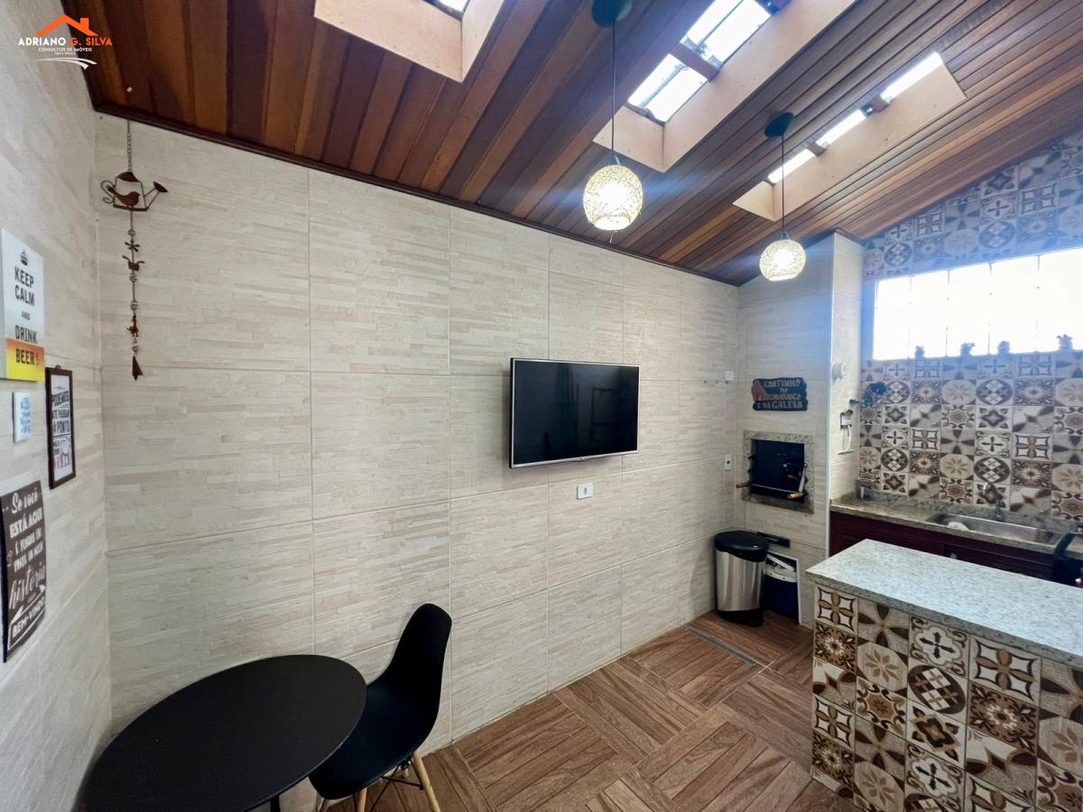 Sala ampla com lavabo, cozinha com armários, área gourmet fechada com churrasqueira.